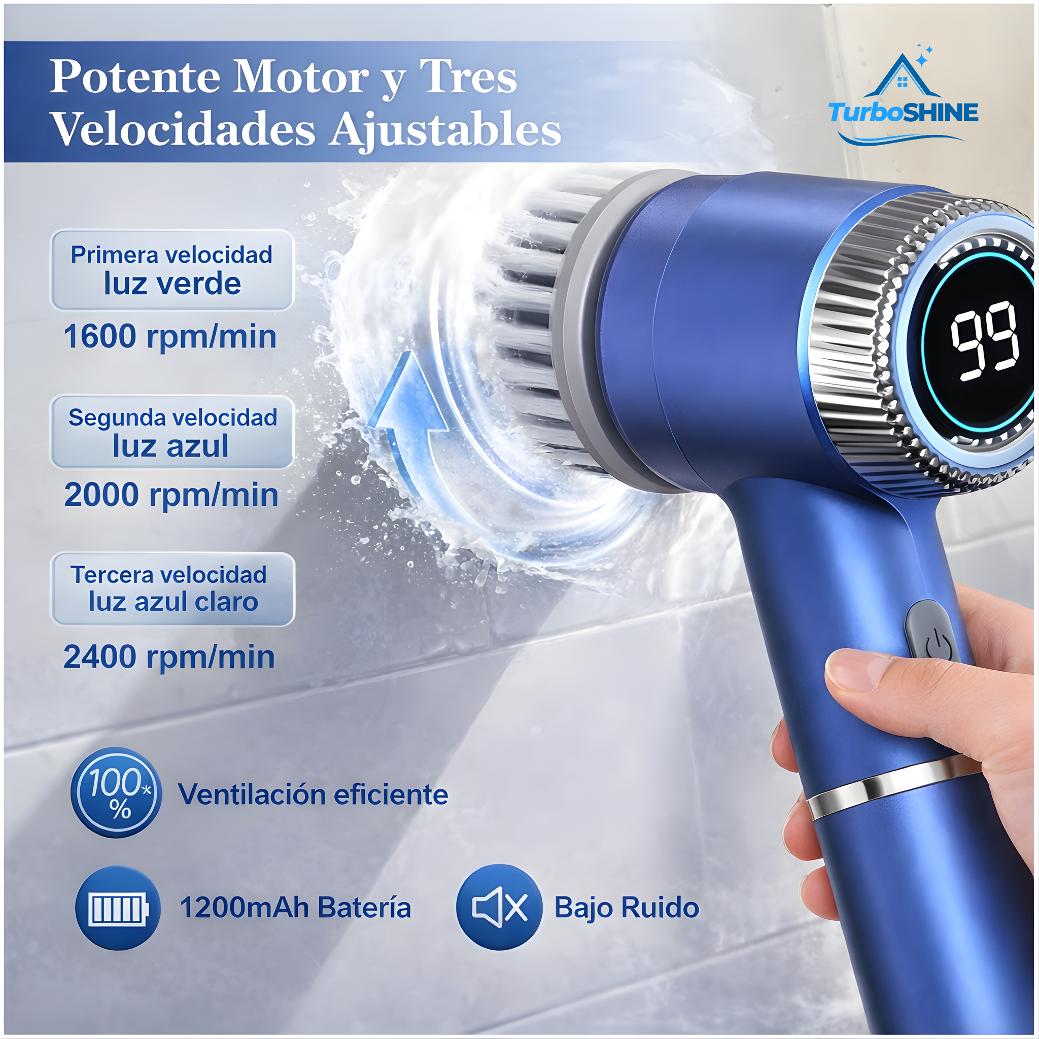 Motor Potente con 3 Velocidades Ajustables ideal para tu limpieza de baño y cocina